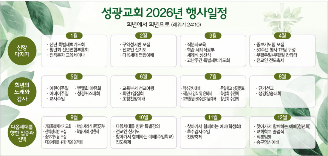 2026 성광교회 표어 및 행사 일정 표어 : 희년에서 희년으로(레위기 25:10) 실천사항 : 1. 신앙다지기 2. 희년의 노래와 감사 3. 다음세대를 향한 집중과 선택