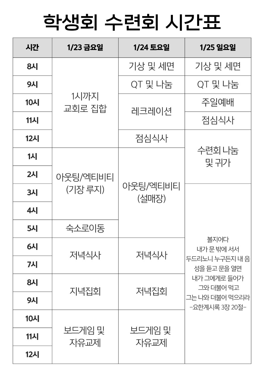 겨울 학생회 수련회를 위해서 기도 부탁드립니다. |